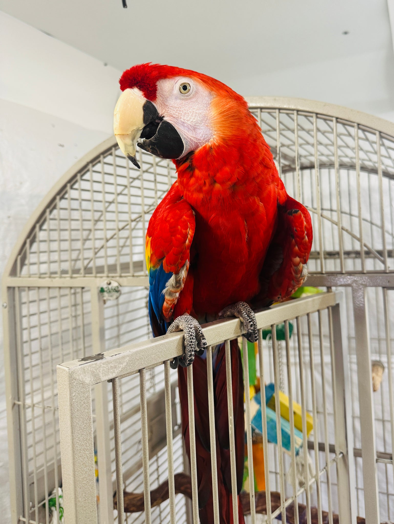 Scarlet macaws like Petra are highly social and inquisitive, and they need plenty of daily interaction, mental stimulation, and space to stay happy. She will do best with someone committed to providing several hours of out-of-cage time, durable toys for chewing, and a spacious cage or aviary setup.