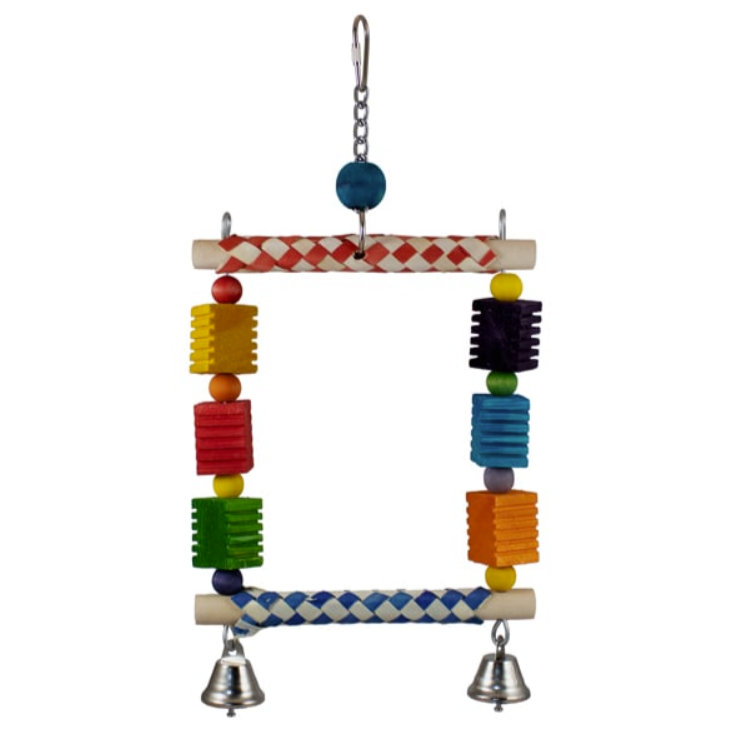 - The 1/2" diameter dowels framing this swing are covered with colorful and crunchy bamboo finger traps and the wire frame sides are adorned with wooded beads, grooved wood blocks, and nickel-plated steel bells to give your bird plenty to explore!