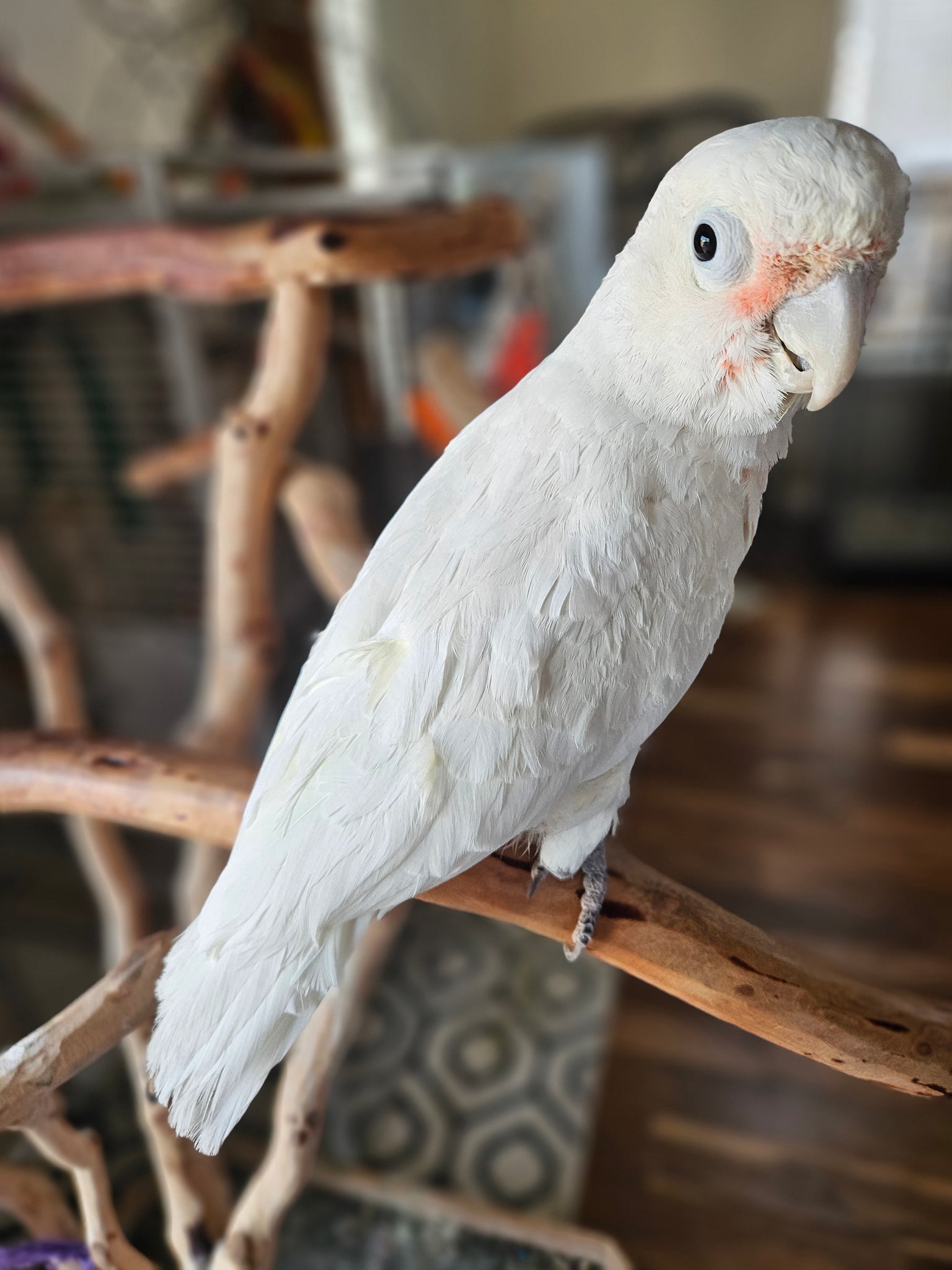 John Wayne is a handsome, male Goffin Cockatoo, estimated to be about 20 years old. He’s a charming guy with a gentle spirit and a curious nature that shines through once he feels comfortable in his environment.