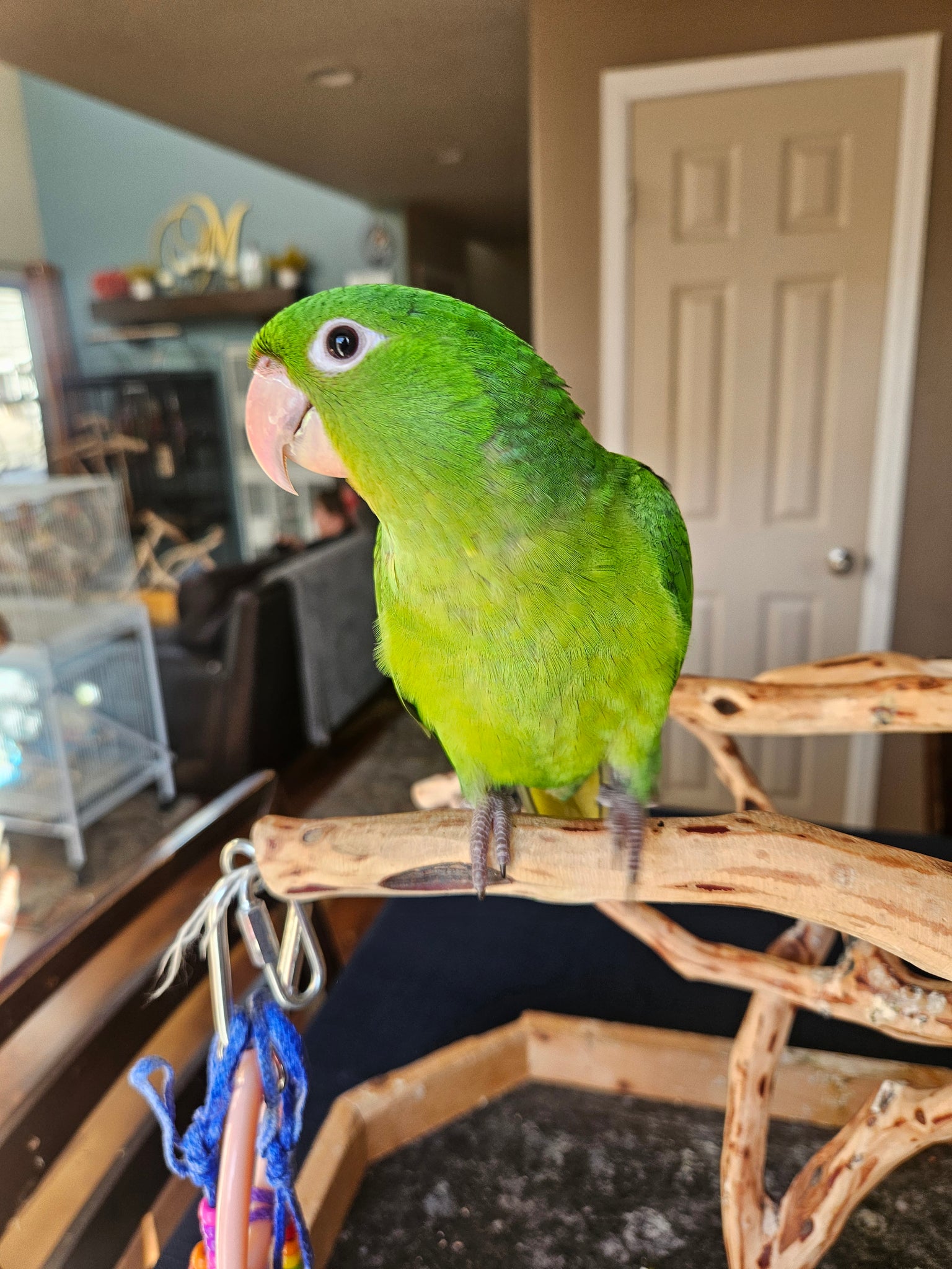 Say ¡hola! to your next feathered fiesta! This handfed Mexican Green Conure baby is a pint-sized party on wings—curious, cuddly, and always ready to be your best amigo! Raised with tons of love, this little green goofball is bursting with personality and charm. Get ready for snuggles, giggles, and nonstop fun with your new beaky BFF!