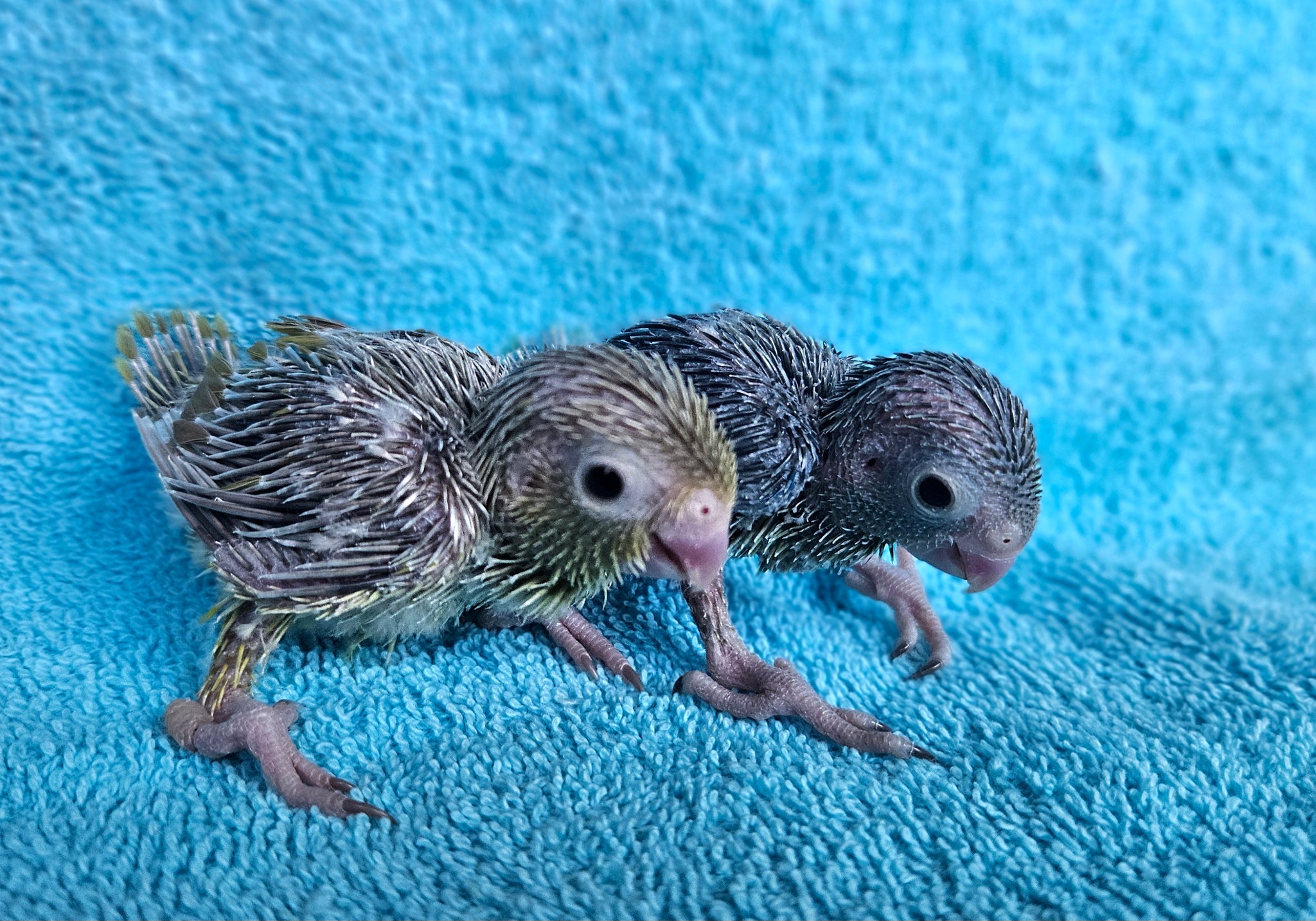 Two pint-sized 🤏 Parrotlet 🐦 hatchlings have emerged from the nest and are thriving! Hand-nurtured daily and growing fast - ready soon to permanently perch with you!